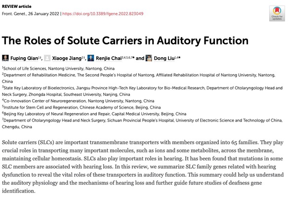 三、SLGs是重要的跨膜载体,在维持细胞内稳态方面起着重要的作用,研究表明,该基因家族中有部分基因与听力障碍有关,论文对SLGs基因在听力功能中的作用进行了综述,于2022年1月发表在《Frontiers in Genetics》。