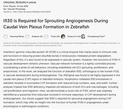 一、干扰素-γ诱导蛋白30 (IFI30)是一种主要存在于免疫细胞中的关键酶,在内吞作用介导的蛋白质降解过程中发挥减少蛋白二硫键的作用,在血管系统中也有表达。研究发现Ifi30缺失损害了内皮细胞和巨噬细胞的细胞行为,包括细胞增殖和迁移,morpholino介导的Ifi30敲低导致斑马鱼胚胎的尾静脉丛(CVP)形成不完全,环路数量、面积和宽度减少,表明Ifi30是血管新生相关的重要基因。相关研究成果于2022年7月发表在《Frontiers in Physiology》。