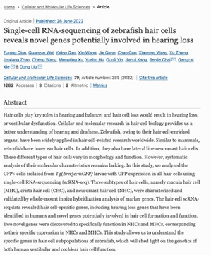 五、毛细胞在听力和平衡中起着关键作用,毛细胞的损失会导致听力损失或前庭功能障碍。我们利用单细胞RNA测序研究了斑马鱼的毛细胞,对黄斑毛细胞(MHC)、嵴毛细胞(CHC)和神经肥大毛细胞(NHC)三种毛细胞亚型进行了标记基因的原位杂交分析,此外还筛选了一些潜在的耳聋相关基因。相关研究2022年6月发表在《Cellular and Molecular Life Sciences》