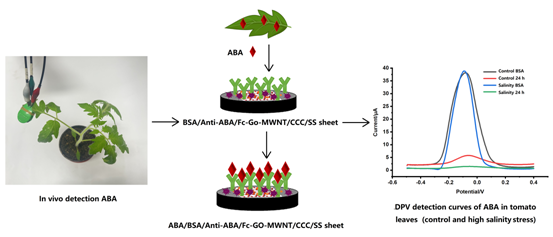 脱落酸(ABA)是一种重要的植物激素,参与调节各种生理过程,包括种子休眠、胁迫反应和发育生长,原位实时监测ABA在植物体内的动态变化可以促进对ABA作用机制的理解。本研究开发了一种新型的电化学免疫电极系统,用于直接检测植物体内的ABA的含量。该系统由液体碳胶、二茂铁-氧化石墨烯-多壁碳纳米管纳米复合材料和 ABA 特异性抗体修饰构建的一次性不锈钢片电极,使得ABA的检测范围为 1 nM至 100 μM,检测限低至 100 pM,并实现高盐胁迫下的番茄叶片中ABA的原位检测。原位检测获得的ABA水平与参与ABA生物合成的2个特异性基因SlNCED1和SlNCED2的表达相关,这一结果表明该系统在研究ABA调控机制的准确性和潜在的应用价值。本研究的电化学免疫电极系统提供了一种可靠灵敏的ABA原位检测方法,为探索ABA在植物生理和胁迫响应中的复杂调控作用提供了新的策略,推动精准农业的发展。文章一经发表,受到了Natural Science News 的关注,并以题为Detecting Plant Hormone in Tomato Leaves Using a Simple Stainless Steel Sensor对文章进行了评论(https://naturalsciencenews.com/article/5840)