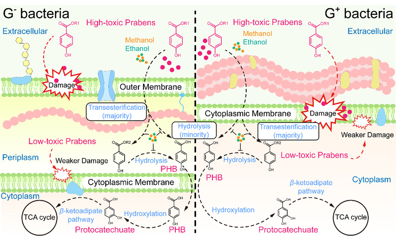 尼泊金酯(对羟基苯甲酸酯)是常用的防腐剂,用于抑制革兰氏阳性菌和真菌增殖。团队通过分离能够降解尼泊金酯的革兰氏阳性菌Microbacterium sp. S1037,发现母液中的溶剂甲醇能够在菌株催化反应过程中7种常见的尼泊金酯发生酯交换生成尼泊金甲酯进一步研究发现酯交换的过程虽然加速了底物的转化,但事实上抑制了尼泊金的水解与代谢。团队发现尼泊金酯对菌株S1037的毒性随着酯碳链的增长而增加,而酯交换的高活性允许细菌利用环境中游离的小分子醇(如甲醇和乙醇等)将高毒性的尼泊金酯迅速转化为低毒性的酯,以规避其对细胞膜和细胞质内生理功能的损伤。这一独特机制,是环境中细菌应对人类的,而进化出的